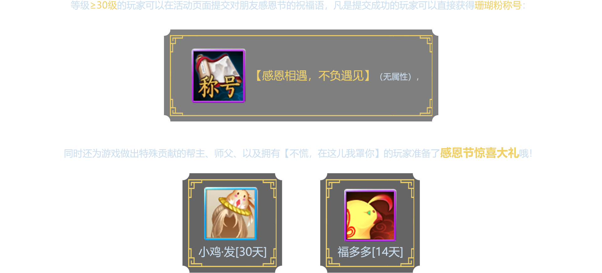 7.称号奖励与感恩节惊喜大礼可同时获得,且互不影响,称号奖励为成功提交祝福获得, 【感恩节惊喜大礼】为满足活动规则6条件的玩家直接获得。